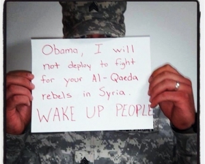 "Обама! Я не битимуться за твоїх повстанців з Аль-Каїди. Люди, прокиньтеся!", - Пише невідомий сержант на постері.