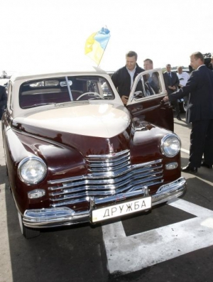 Дмитро Медведєв в"їхав на площу на власній "Побєді" білого кольору. Віктор Янукович теж їхав на "Побєді", тільки вишнево-кавового кольору. На українському авто був номерний знак "Дружба", а на російському простий номер - "Х 315 РЕ"."Було помітно, що український президент давно не сидів за кермом. Коли він почав виходити з машини і однією ногою стояв на асфальті, його "Побєда" почала повільно котитися назад. Пану Януковичу довелося швидко повернутися в машину, щоб поставити її на ручне гальмо", - пише видання.