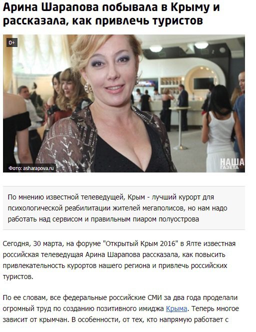 Відзначається, що в 2016 році телеведуча побувала в окупованому Росією Криму та розповіла, як залучити туристів. За її словами, федеральні російські ЗМІ виконали величезну працю по створенню позитивного іміджу півострова, а тепер все залежить від кримчан.