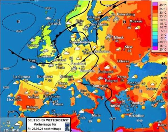 Вихідними в Україну прийде холодний атмосферний фронт, який принесе дощі й грози. Також послабне спека, яка досягне в суботу західних областей, а в неділю - півночі. У понеділок температура повітря буде +25...29°С, а на сході стовпчики термометрів покажуть +28...31°С.