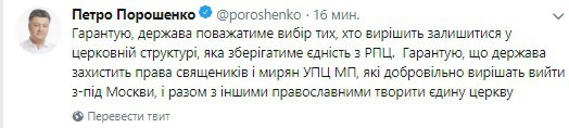 Додав, що держава поважатиме вибір тих, хто вирішить залишитися у церковній структурі, яка зберігатиме єдність з Російської православної церки. А також, що держава захистить права священиків і мирян УПЦ МП, які добровільно вирішать вийти з-під Москви, і разом з іншими православними творити єдину церкву.