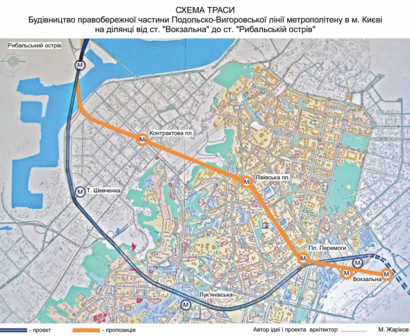 Також пропоную йти через Гавань не вздовж, а в напрямку станцій метро "Контрактова площа" і "Львівська площа". Під землю варто спускатись перед вулицею Набережно-Хрещатицькою. Так ми зекономимо майже 1,2 кілометрів мосту, це близько $100 мільйонів. Мій варіант не вимагає нічого розвалювати, когось відселяти. Нова лінія метро буде перетинатись із Сирецько-Печерською гілкою на станції "Львівська брама". Переваг маса: це і скорочення часу поїздки, зменшення довжини мосту через затоку Гавань з 500 до 200 метрів. Відмова від перенесення підприємств, будівництва автомобільної естакади і прискорене введення мосту в експлуатацію. Збереження інженерних комунікацій на значній території Подолу. Значно зменшується екологічне забруднення від введення надземного будівництва та шуму транспорту на естакаді в районі Подолу.