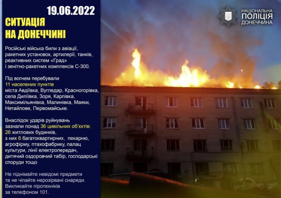 Окупанти обстріляли 11 населених пунктів: міста Авдіївка, Вугледар, Красногорівка, села Диліївка, Зоря, Карлівка, Максимільянівка, Малинівка, Маяки, Нетайлове, Первомайське. Били з авіації, ракетних установок, артилерії, танків, реактивних систем "Град" і зенітно-ракетних комплексів С-300.