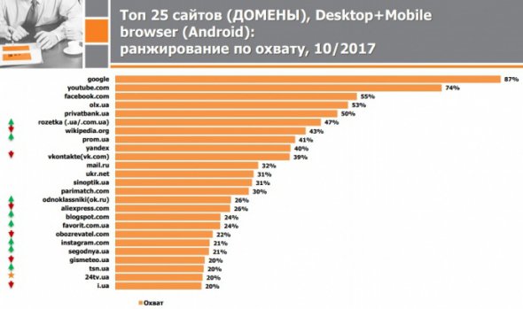У трійку лідерів традиційно ввійшли – Google, YouTube та Facebook. На них припадає 87%, 74% та 55% українських користувачів відповідно.