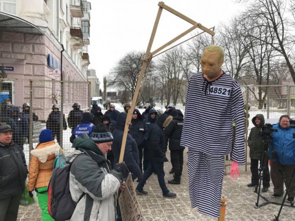 Учасники пікети відзначились тим, що встановили шибеницю, на якій повішене опудало Володимира Путіна, вдягненого в одяг в'язня. Подібний випадок стався не вперше, минулого року біля того ж посольства РФ в Україні повісили опудало російсього президента з підписом "Убийца".