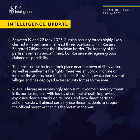 Приналежність партизанів залишається непідтвердженою, але відповідальність узяли російські антиурядові угруповання, повідомило 23 травня міністерство оборони Великої Британії у Twitter.