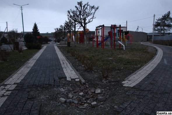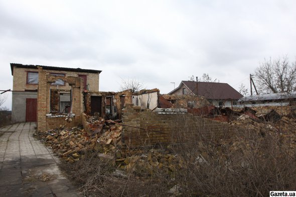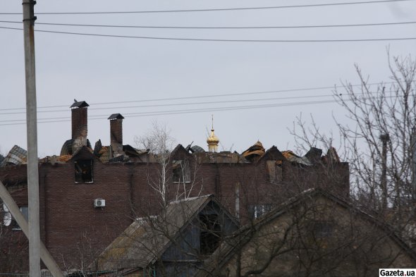 Проїжджаємо повз приватні будинки. Паркани прошиті кулями, рештки обірваних дротів де-не-де звисають зі стовпів. Між усього привертають увагу хати, що стали руїнами - деякі розсипалися на друзки й чорні розвалини припадають снігом, що літає в повітрі.