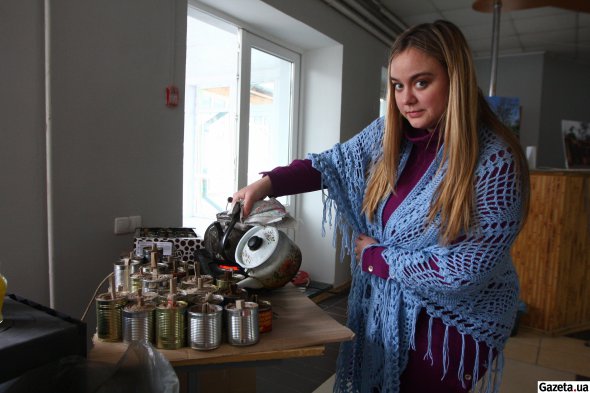 Заходимо всередину крізь високі скляні двері. У просторій залі у два ряди стоять столи й стільці, тепло й пахне горілим воском. Біля панорамного вікна ліворуч за круглим столиком стоїть молода жінка. Пасма пшеничного волосся спускаються на вʼязану гачком хустку, який вона накинула на плечі. Із залізного чайника, що вже нагорів внизу, розливає віск у жерстяні банки.