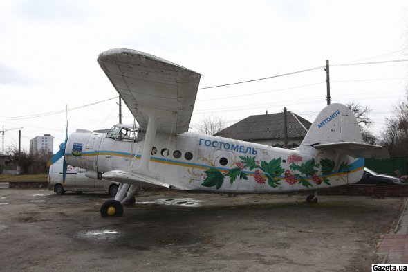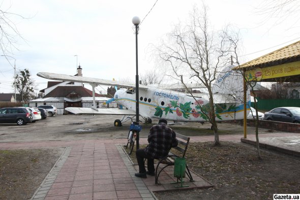 Через дорогу від кіосків простягається зелена алея з каштанами, бруківкою та коричневими лавками. Одразу за нею - білий літак із написом "Гостомель", обвитий синьо-жовтою "стрічкою" й пагонами калини.
