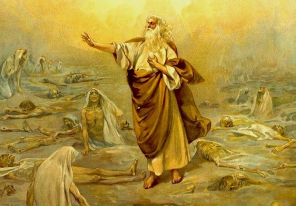 Видіння про сухі кістки на полі - прообраз загального воскресіння з мертвих і нового вічного життя відкуплених Хресною смертю Господа Ісуса Христа.