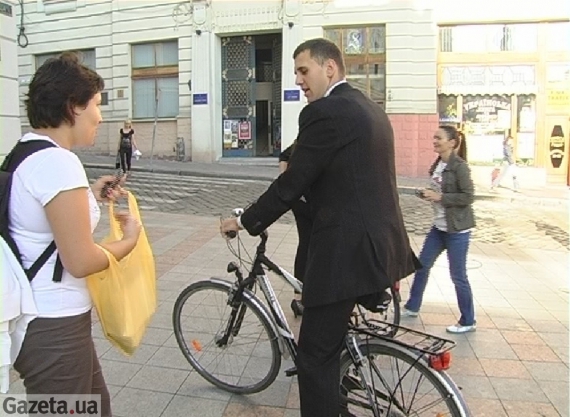 Менш свідомими виявились працівники Чернівецької обласної ради. Коло Будинку з левами було повно автівок. Там ми зустріли лиш одного депутата обласної ради Віталія Захарюка, 32 роки, який наважився весь день вирішувати свої справи не на машині, а все ж таки на велосипеді.