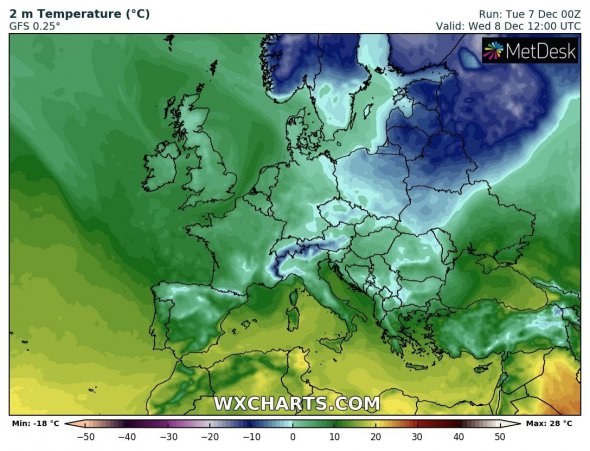 На Півночі, у Вінницькій області вночі 0...-4°C, удень приблизно 0°C, на Київщині й Житомирщині -1...3°C. У більшості Центральних областей вночі приблизно 0°C, удень +2...5°C, у Дніпрі з районами до +6°C. На Сході вночі +2...6°C, вдень +4...11°C. На Півдні вночі +4...7°C, а вдень +5...13°C.