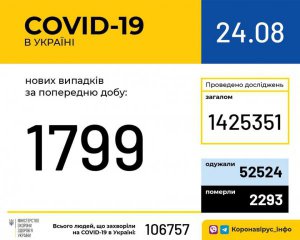 Станом на 9:00 24 серпня в країні 106 757 лабораторно підтверджених випадків, з них 2293 летальний, 52 524 пацієнтів одужало, повідомило Міністерство охорони здоров'я.