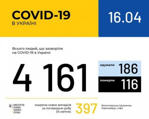 Станом на 9:00 16 квітня, в Україні 4161 лабораторно підтверджений випадок Covid-19, із них 116 летальних, 186 пацієнтів одужали.