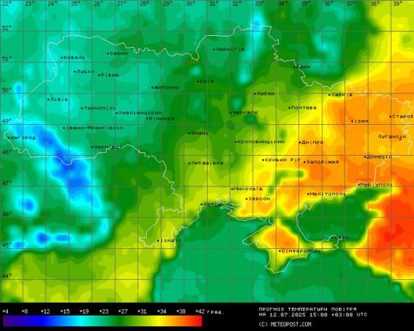 "У західних областях зовсім інша термічна картинка, 12 липня температура повітря становитиме +21...25 градусів. У північній частині України погода обіцяє комфортну літню паузу від спеки, вдень +24...28 градусів. У центральних областях впродовж дня передбачається: на Вінниччині +22...24, на Черкащині та Полтавщині +25...29, у Кропивницькому з районами +26...30, на Дніпропетровщині +30...35 градусів", - написала вона.