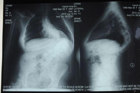 17-річній Інні Варич з міста Умань на Черкащині терміново потрібна операція із виправлення хребта. У неї сколіоз найважчого 4 ступеню, хребет викривлений вже на 95 градусів. Через це почалися проблеми із серцем та внутрішніми органами. Ситуація ускладнюється тим, що у Інни з дитинства немає лівої руки. Якщо не зробити операцію дівчинці загрожує інвалідне крісло.