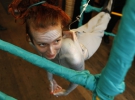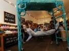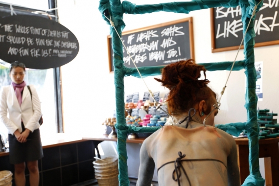 Це не перший перформанс, який влаштувала художниця, підвішуючись до стелі на гачках. Аналогічні заходи були проведені в косметичних магазинах Лондона й Гонконгу.