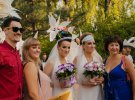 Після офіційної частини дівчата кинули в натовп букети. Зняли одна з одної підв'язки і кинули їх для неодружених хлопців.