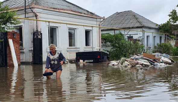 Жінка йде по затопленій вулиці після рясних опадів у Керчі, окупований Крим.