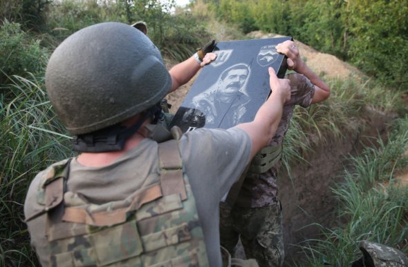 Українські солдати встановлюють пам'ятник своєму побратимові на позиції фронту на околиці міста Торецьк на Донеччині.
