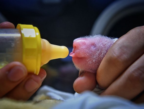 Годування дитинча панди у заповіднику гігантських панд Шеншупінг в провінції Сичуань у Китаї. Гігантська панда на ім'я Чжен Чжень народила двох дитинчат у липні.