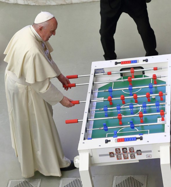 Папа Франциск грає в інклюзивний настільний футбол, який йому подарували.