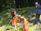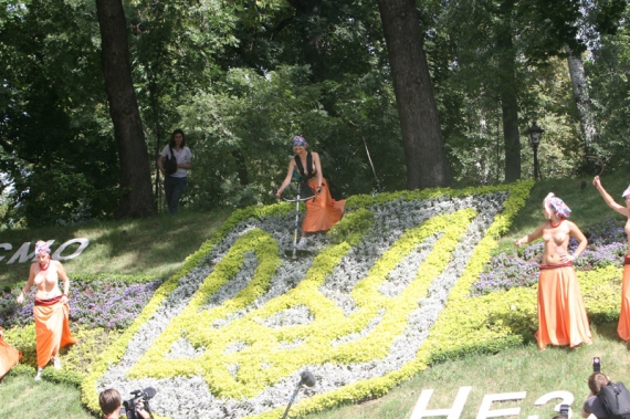 Напівоголені дівчата з серпами та газонокосарками викошували траву, вигукуючи "Хай живе, залежність!", "З Днем залежності!". Газон було майже повністю знищено.