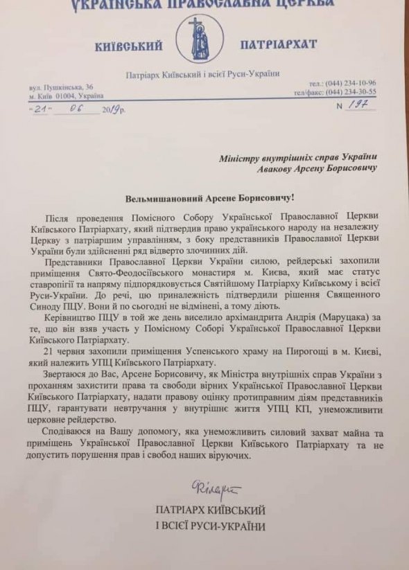 "Звертаюсь до вас, Арсене Борисовичу, як до міністра внутрішніх справ України з проханням захистити права та свободи вірних Української православної церкви Київського патріархату, надати правову оцінку протиправним діям представників ПЦУ, гарантувати невтручання у внутрішнє життя УПЦ КП, унеможливити церковне рейдерство", — закликав Філарет.