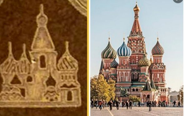 Про те, чи це дійсно зображення кремлівської церкви, підтверджень нема. Собор Василя Блаженного є візитівкою Москви, одним із найвпізнаваніших місць Росії. Зокрема завдяки своїм цибулеподібним баням, що символізують полум'я свічки. Більшість таких храмів були побудовані у XIV ст., як і Собор Василя Блаженного.