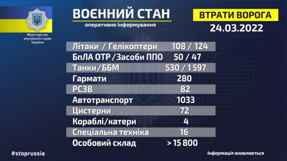 Втрати особового складу російського ворога станом на ранок 24 березня орієнтовно становлять понад 15,8 тис. осіб.