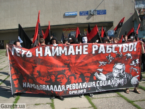 "Наш Першотравень - це не свято праці і не свято миру, як до того довгі роки привчав нас режим СРСР і його сучасні буржуазні спадкоємці, - виголосив російською промову гість з Москви. - Наш Першотравень - це свято боротьби! Це свято нещадної класової боротьби за визволення гнобленої капіталом праці. Це свято боротьби всіх чесних людей за те, щоб земля, всі її ресурси і багатства, всі засоби виробництва належали народу, а не зграї капіталістичних кровососів: чиновників, міністрів, чекістів, поліцаїв, олігархів, банкірів і спекулянтів. Ми вимагаємо: владу народам!"