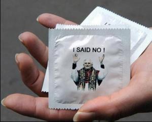 На обгортці презервативів зображений Бенедикт XVI і стоїть підпис: "Я сказав "ні"! Ми говоримо "так!"