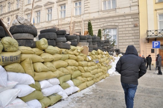 Усього одна ніч знадобилася львівським активістам, аби обнести будівлю львівської обласної державної адміністрації колючим дротом, обкласти мішками із піском заввишки два метри та встановити дерев'яні загострені палиці. На двох входах поставили міцних хлопців, які перевірюють сумки і рюкзаки усіх охочих зайти всередину. Шукають коктейлі Молотова чи зброю.