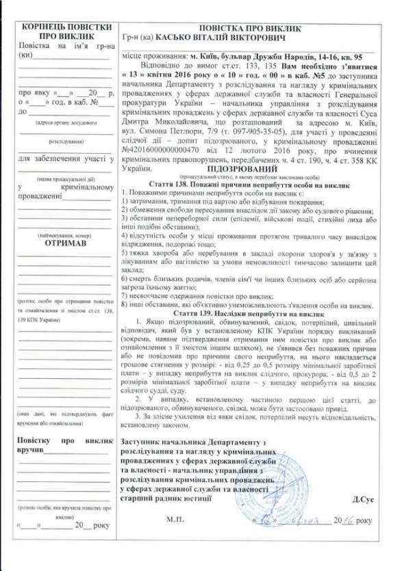 Генеральна прокуратура України викликає колишнього заступника генерального прокурора Віталія Касько на допит 13 квітня.