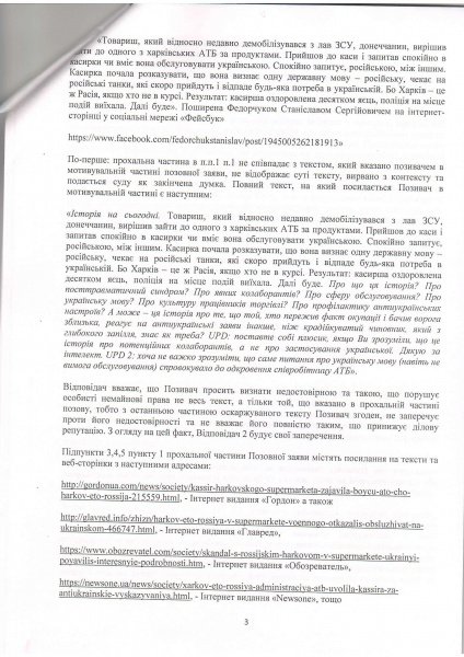 "Жодним чином і ніякими доказами не підтверджено, що Станіслав Федорчук є саме тою особою, на яку посилається Позивач. Крім того, надання інформації з ЄДРПОУ щодо ГО "Українська народна рада Донеччини та Луганщини" жодним чином не ідентифікує Голови цієї організації з особою, яка розмістила інформацію через соціальну мережу Facebook. Мережа Facebook не є ні веб-сайтом, ні зареєстрованим ЗМІ. Відповідно, будь-яка особа може зареєструвати свою сторінку. При цьому жодного документу для ідентифікації або яких-небудь вимог для особистої сторінки мережа не висуває. Тобто, будь-яка людина в будь-якій країні світу може зареєструвати сторінку, наприклад, відомої особистості, написати її ім'я, виставляти фото і відео-матеріали на цій сторінці. Однак це не є підтвердженням належності до цієї особи ні цієї сторінки, ні інформації, яка на ній знаходиться", - пояснили свою позицію в Дарницькому суді Станіслав Федорчук та його адвокат Вольга Шейко.