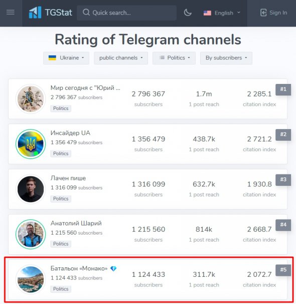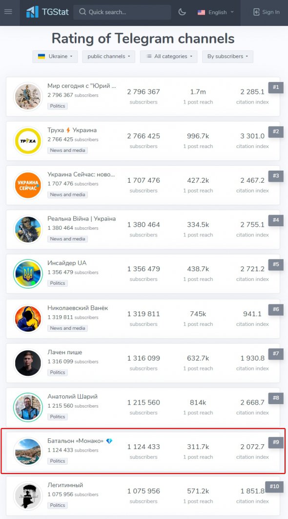 Якщо подивитися по категоріях, то "Батальон "Монако" займає п'яту позицію у категорії "політика" та третім саме серед українських каналів за кількістю підписників.