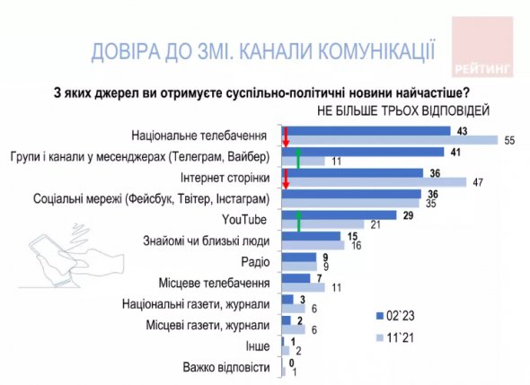 Станом на лютий 2023 року, за даними соціологічної групи "Рейтинг" месенджери майже наздогнали національне телебачення за рівнем довіри українців та стали одним з основних джерел інформації (41% громадян отримують суспільно-політичні новини саме з месенджерів).