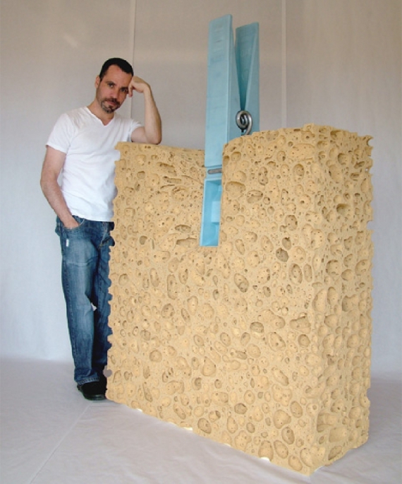 Він робить величезні скульптури таких повсякденних речей як прищіпки, губки для ванної, сірники та ін.