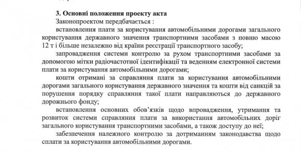 Також законопроєкт передбачає запровадження системи контролю руху транспортних засобів і електронної системи плати за користування дорогами.