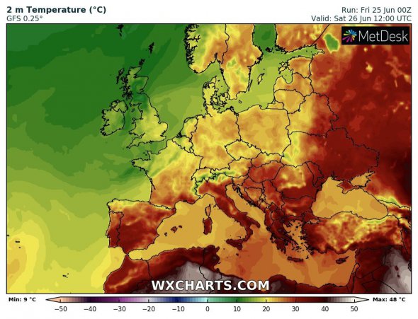 "26-27 червня Україну із заходу на схід перетинатиме холодний атмосферний фронт. У його зоні - неймовірні термічні контрасти, від +37°С перед ним до +23°С за ним. Тому дощі та грози можуть подекуди супроводжуватися сильними зливами, градом та шквалами. За такої синоптичної ситуації з такими контрастами навіть є ймовірність смерчів", - йдеться в повідомленні.