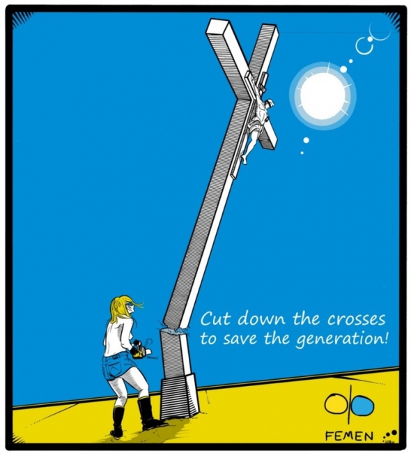 Заклик пиляти хрести на знак протесту проти діяльності РПЦ пролунав від учасниць руху у відповідь на судовий процес над Pussy Riot. У день оголошення вироку активістки FEMEN реалізували його, спилявши дерев'яний хрест на площі Незалежності в Києві, і повідомили про намір продовжити аналогічні акції в ряді міст Росії.