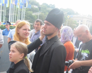 9.00 Біля Європейської площі збирається близько сотні людей. Переважно — літні жінки. Скромно вдягнуті, з іконами у руках. Розважала їх та міліцоінерів, що стояли навкруги, киянка Ірина Бєлкова.