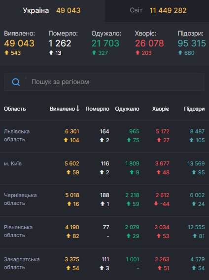 В Україні станом на ранок понеділка 6 липня виявлено 543 нових випадки Covid-19, 327 осіб з числа раніше хворих одужали, 13 хворих померли.