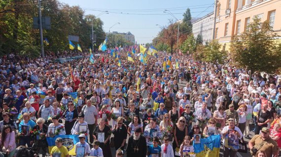 Попереду йдуть вдови та матері загиблих. Деякі кияни стоять на колінах. Лунає патрітична музика. Водії машин просять киян розступитися, оскільки колона завелика і займає всю проїжджу частину.