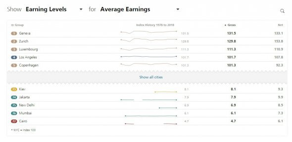 За рівнем зарплат столиця України посіла 73 місце. Менше ніж у Києві заробляють у індонезійській Джакарті, індійських Нью-Делі та Мумбаї та єгипетському Каїрі.
