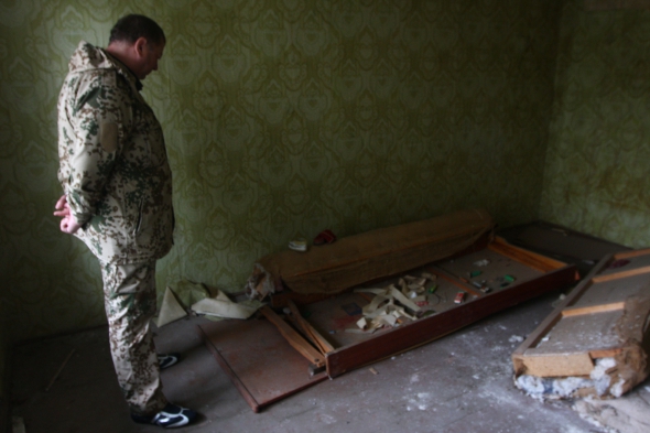 Квартира Москаленка на першому поверсі. Вікна в ній вибиті. Двері лежать на підлозі, в залі - розламаний диван. У ньому - дитячий черевичок.