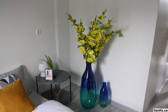 Під ліжком лежить мʼякий бежевий коврик з китицями. Поруч маленький столик і дві високі сині вази. На стіні висить картина з рожевими й жовтими тюльпанами. З обох боків ліжка вмонтовані розетки.