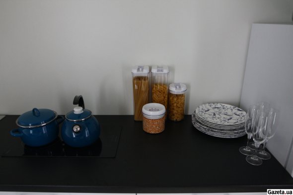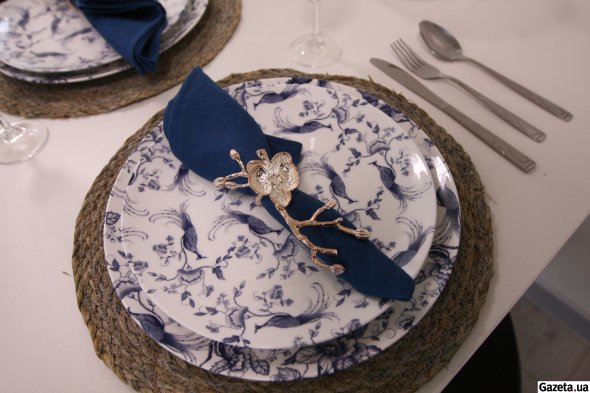 На столі стоять стильні банки з крупами й макаронами, тарілки й келихи для шампанського. Чайник і кастрюля в тон зі шторами й тканинними серветками, що лежать на засервірованому кухонному столі. Вони – на тарілці із сірим узором, аккуратно підперезані золотими кільцями у вигляді квітів.