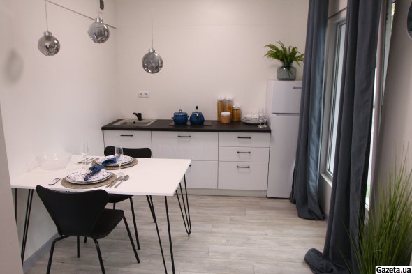 Одразу з порогу потрапляємо на кухню – простора кімната з білими стінами й шторами морського кольору. Вікна нестандартного розміру – майже панорамі. Кухонний гарнітур також білий, встановлена електроплита на дві конфорки, рукомийник і холодильник.
