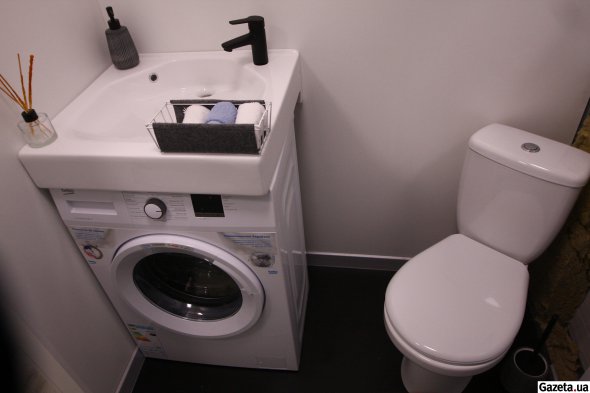 У кімнаті світло й просторо. Є одна центральна лампа й три сріблястих світильники над столом, що доповнюють інтерʼр. Звідси можна потрапити у ванну кімнату. Там встановлена душова кабіна зі шторкою, мийка й унітаз.